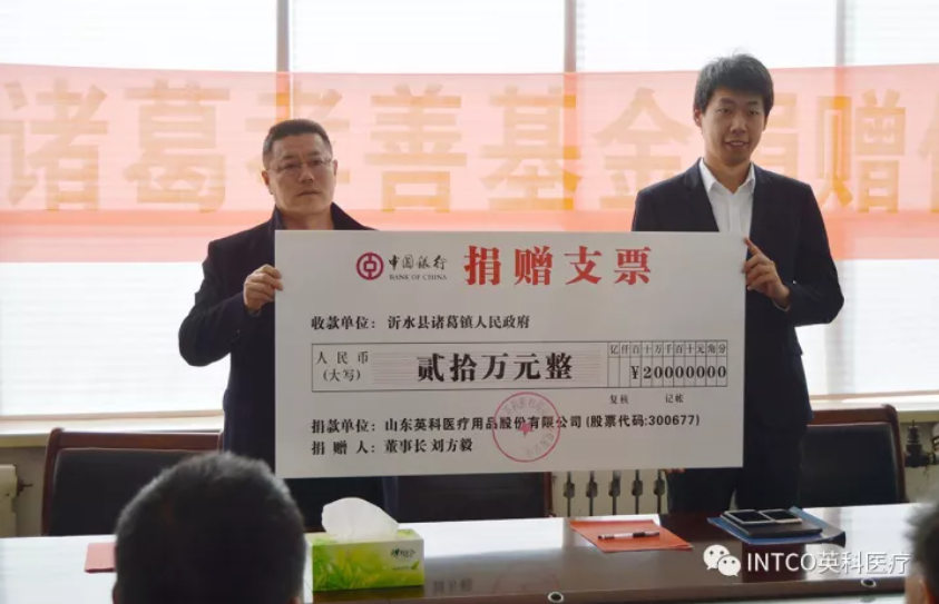 12月6日,山东球盟会医药用品股份有限公司(股票代码:300677)董事长刘方毅先生向革命老区沂水县诸葛镇捐赠孝善基金人民币20万元,助力诸葛镇政府孝善事业的运营和开展,董事长助理穆天雨代表公司参加捐赠仪式。